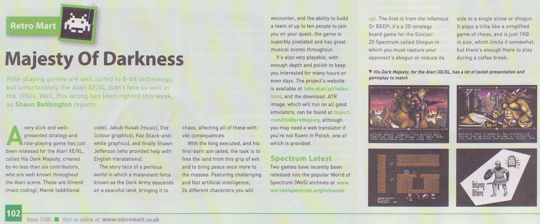 "His Dark Majesty e um titulo interessante tanto para os fas do antigo sistema Atari quanto para os fas de estrategia que procuram uma experiencia diferenciada..."